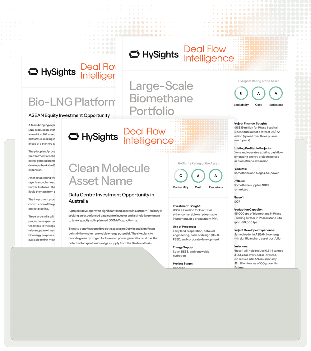 HySights Deal Flow Intelligence spotlights compelling clean molecule asset developments so you can find your next investment.