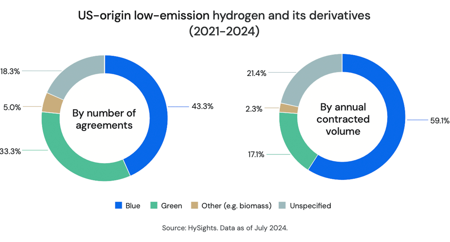 Furthermore, in a sign of where momentum is today, there have been eight blue contracts signed for US-origin hydrogen and derivatives in 2024, versus four for green. One European new energy project developer confided with HySights that, while green hydrogen projects were publicly still being pursued, blue US hydrogen projects were their focus.