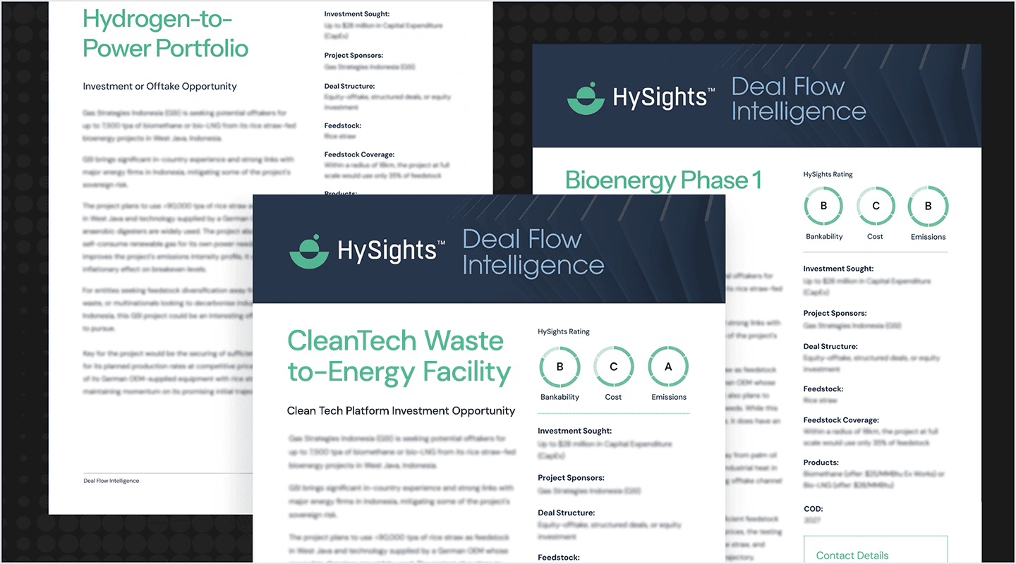 Find out how HySights can benchmark an asset's quality, accelerate fundraise through HySights Deal Flow Intelligence, or enhance your understanding of market dynamics across clean molecules.