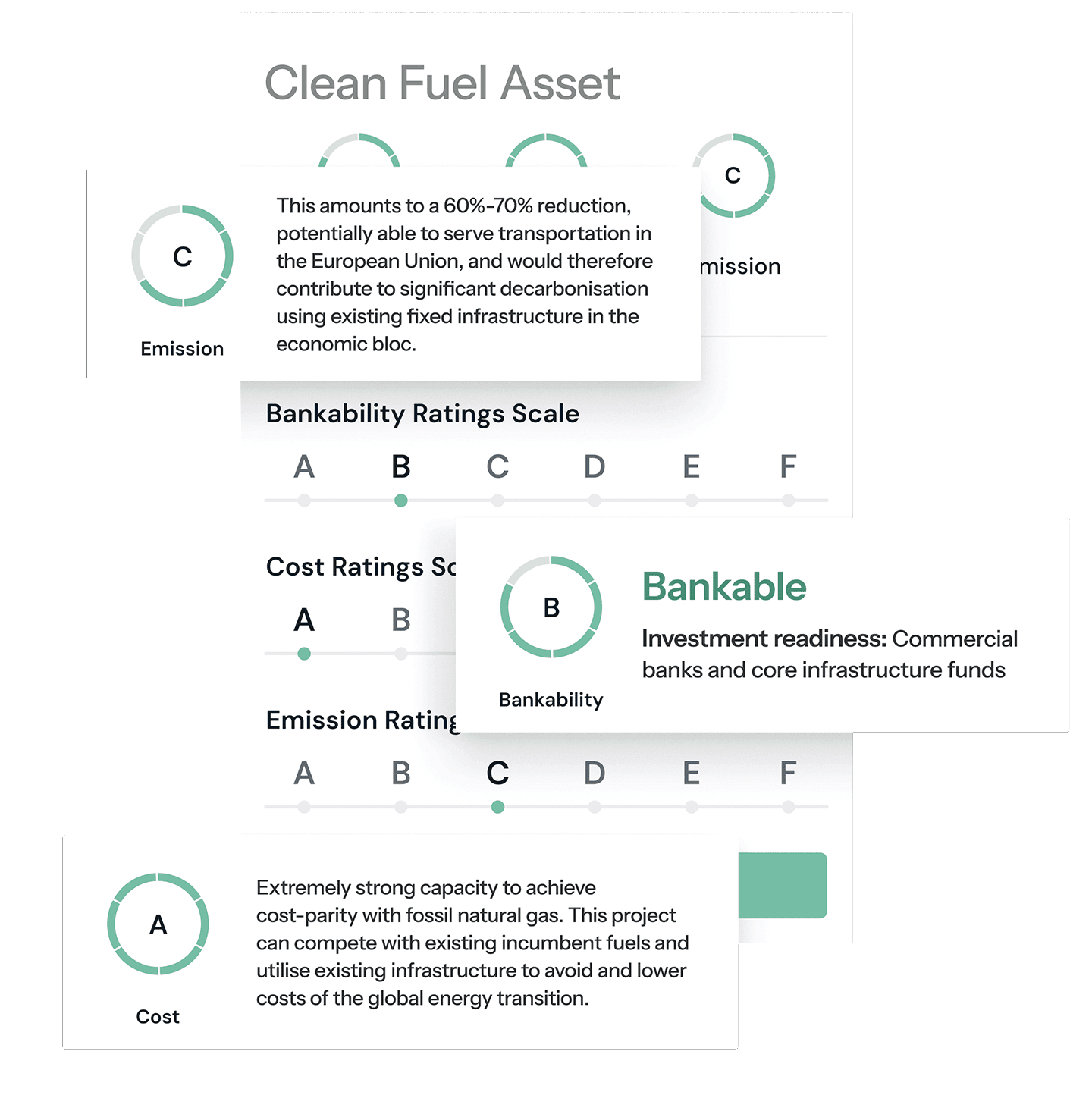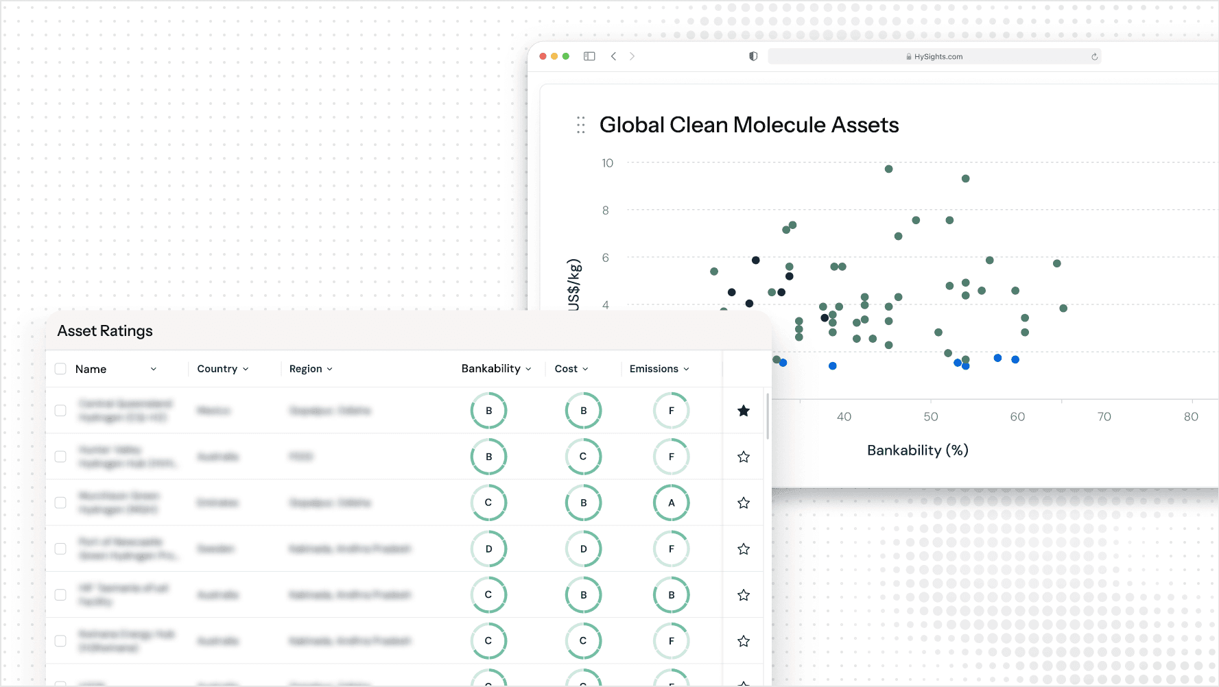 HySights asset ratings predict how a proposed clean molecule asset will perform across the three dimensions critical to commercial decision-makers: Bankability, Cost, and Emissions.